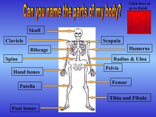 The document describes the various bones that make up the human skeleton. It provides information on the skull, clavicle, ribcage, spine, hands, patella, feet, scapula, humerus, radius and ulna, pelvis, femur, tibia and fibula. An interactive quiz asks the reader to identify the number of bones in the human body, which is correctly answered as approximately 206 bones.