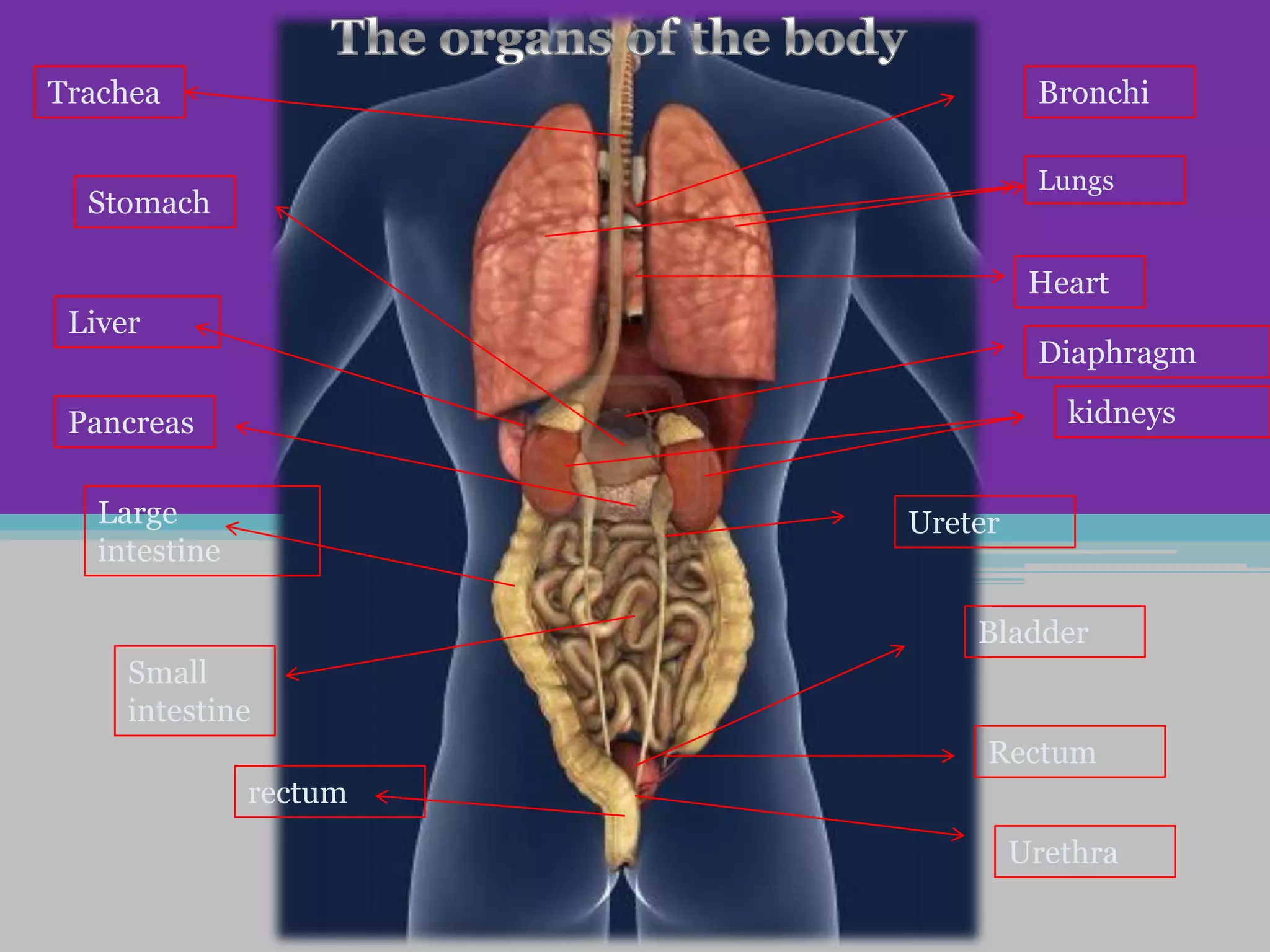 The document lists the major organs of the respiratory and digestive systems from top to bottom: trachea, bronchi, lungs, stomach, heart, liver, diaphragm, pancreas, kidneys, large intestine, ureter, bladder, rectum, and urethra. It then shows illustrations of muscles of the front and back of the body, labeling major muscle groups. Finally, it provides a diagram labeling the major bones of the human skeletal system.