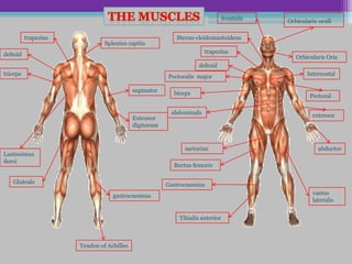 The document lists the major organs of the respiratory and digestive systems from the trachea down to the rectum and urethra. It then shows a diagram of the front and side views of the muscular system labeling many major muscles like the trapezius, deltoid, pectoralis major, abdominals, gluteals, gastrocnemius and more. The last part diagrams the skeleton labeling bones like the skull, clavicle, scapula, humerus, ribs, vertebral column, sacrum, coxa, femur, tibia, fibula, carpals, metacarpals, tarsals, and phalanges.