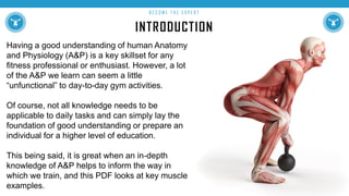 This document provides an overview of human anatomy and physiology relevant to fitness professionals, emphasizing the importance of understanding muscle functions for effective training. Key muscle groups discussed include the calves, hamstrings, quadriceps, gluteals, hip flexors, and several others, detailing their anatomical roles and how they relate to exercise performance. It highlights the significance of muscle engagement and proper techniques to enhance training outcomes while preventing injuries.