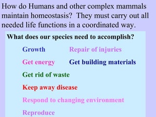 The document discusses the 11 body systems that work together to maintain homeostasis and carry out life functions. It focuses on the skeletal, muscular, digestive and excretory systems. The skeletal system provides structure and levers for movement. Muscles contract and relax to produce both voluntary and involuntary movement. The digestive system breaks down food into nutrients that are absorbed and circulated. The excretory system removes waste through the skin, lungs and kidneys. Together these systems allow humans to obtain nutrients, move, and remove waste.