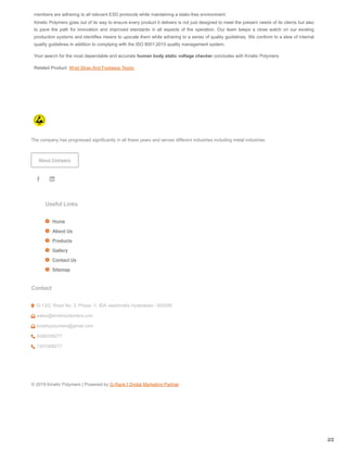 Kinetic Polymers, a leading name in ESD solutions, offers advanced Human Body Static Voltage Checkers designed for precision and reliability. These devices play a crucial role in detecting and measuring static voltage on personnel, ensuring safety and compliance in sensitive work environments such as electronics manufacturing, cleanrooms, and laboratories. With user-friendly interfaces and cutting-edge technology, Kinetic Polymers' static voltage checkers help mitigate the risk of electrostatic discharge (ESD) damage, protecting delicate components and ensuring operational efficiency. Trust Kinetic Polymers for innovative ESD management tools that prioritize safety and quality.