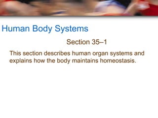 The document provides information about the major human body systems and how they work to maintain homeostasis. It discusses the levels of organization from cells to organ systems. The main organ systems described are the nervous, skeletal, integumentary, endocrine, lymphatic/immune, muscular, reproductive, respiratory, excretory, circulatory, and digestive systems. It also explains how feedback inhibition allows the hypothalamus to regulate body temperature and maintain homeostasis.