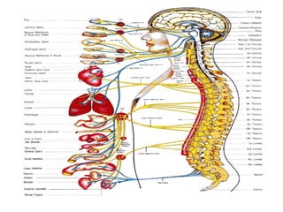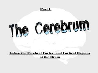 The document discusses the major parts and structures of the human brain. It describes the cerebrum, cerebral cortex, lobes of the brain including the frontal, parietal, occipital and temporal lobes. It outlines key sulci and fissures that divide regions of the brain. The document also discusses the cerebellum, brainstem, and spinal cord as well as cranial and spinal nerves. Finally, it provides an overview of the autonomic nervous system and sensory organs including skin, eyes, ears, nose and tongue.