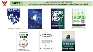 กิจการโทรทัศน์ และกิจการโทรคมนาคมแห่งชาติ ข้อคิดสาหรับผู้บริหารในยุคดิจิทัล 1. องค์กรส่วนใหญ่ไม่ได้ตอบสนองต่อ Digital disruption โดยทันที แต่จะตอบสนองก็ต่อเมื่อมันได้ผ่านมาได้ในระยะหนึ่งแล้ว หรือเมื่อสายไปเสียแล้ว 2. เหตุผลสาคัญที่องค์กรพึงพอใจกับสิ่งที่ตนเองเป็นอยู่ และหยุดนิ่งอยู่กับที่ ก็คือความรู้สึกว่าจะต้องล้มเหลวหากมีการ เปลี่ยนแปลง 3. องค์กรที่ประสบความสาเร็จ มักจะมีการใช้ผู้เชี่ยวชาญด้านดิจิทัล เพื่อเข้ามาทาการเปลี่ยนแปลงองค์กร 4. องค์กรที่ประสบความสาเร็จ และยังคงอยู่รอดต่อไป มักจะมีการให้บริการที่เลียนแบบจากคู่แข่งที่กาลังจะเข้ามาใหม่ในตลาด 5. ผู้ครอบครองตลาด จาเป็นที่จะต้องทบทวนรูปแบบธุรกิจอย่างต่อเนื่อง เพื่อให้แน่ใจว่ารูปแบบธุรกิจของตัวเองไม่ล้าสมัย และทันสมัยไปอีกขั้นอยู่เสมอ 6. ในขณะที่โลกยุคใหม่มีการขับเคลื่อนด้วยเทคโนโลยีดิจิทัลมากขึ้นทุกขณะ คู่แข่งใหม่มักจะเกิดขึ้นจากอุตสาหกรรมที่ใกล้เคียง กัน ที่จะเข้ามาท้าทายอานาจเดิม 7. ในปัจจุบันจะไม่มีคาถามอีกต่อไปแล้วว่า การปฏิวัติดิจิทัลจะเกิดขึ้นเมื่อใด แต่คาถามจริงๆที่กาลังเกิดขึ้นก็คือ "องค์กรจะรับมือ อย่างไร กับการปฏิวัติดิจิทัลที่เกิดขึ้น ณ เวลานี้"