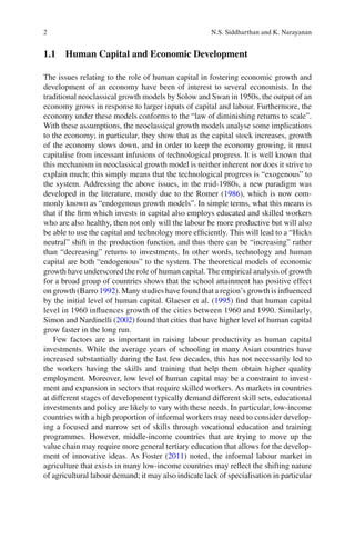 This chapter discusses the link between human capital development and economic growth. It provides an overview of different economic theories around this link, from traditional neoclassical growth models to newer endogenous growth models which view human capital and technology as endogenous to the system. The chapter then discusses factors important for raising labor productivity like investments in education and skills training. It examines debates around vocational versus general education and considers how different types of education may be more appropriate for countries at different development levels and with different economic structures. Finally, it briefly discusses how current technology favors skilled labor and production of differentiated goods.