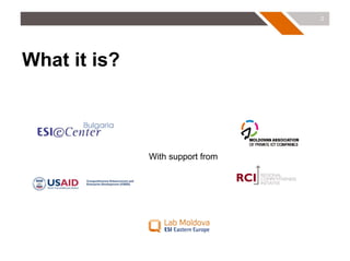 This document outlines the mission, vision, and 3-year goals of QLab, an organization that supports the competitiveness and maturation of Moldova's ICT sector. QLab's mission is to actively transfer knowledge to contribute to economic growth through enhancing the ICT sector. Its vision is to become the main counterpart for businesses and government on ICT research and innovation. Over 3 years, QLab aims to train one third of private IT companies and specialists, triple the output of the education system in IT, and improve processes and certification for private companies in strategic areas.
