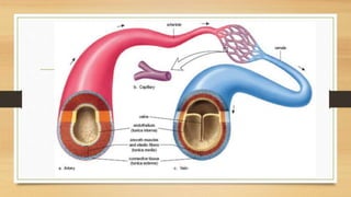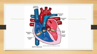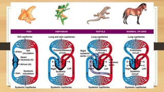 The circulatory system transports nutrients, gases, hormones, blood cells, and other substances to and from cells in the body. It consists of the heart, blood vessels, and blood. The heart pumps blood through two circuits: the pulmonary circuit, which carries deoxygenated blood to the lungs for oxygenation, and the systemic circuit, which carries oxygenated blood to the body's tissues before returning deoxygenated blood back to the heart. Blood contains red blood cells, white blood cells, platelets, and plasma. Red blood cells contain hemoglobin and carry oxygen. White blood cells are part of the immune system. Platelets help blood clotting. The circulatory system allows for gas, nutrient, and waste