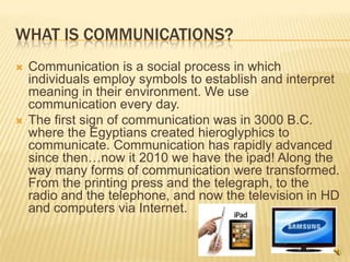 Communication is a social process that involves using symbols to establish and interpret meaning. It has evolved greatly over time from hieroglyphics to modern technologies like the internet. There are many types of communication including verbal, nonverbal, small group, public speaking, intercultural, and interpersonal. Communication is used everyday in classrooms, entertainment, emergencies, and personal relationships. A communication degree can open doors to careers in fields like human resources, advertising, journalism, and government. Famous people like Jay Leno, Bob Costas, and Denzel Washington have used communication skills to achieve success in entertainment and media. The document concludes that communication is a versatile field that develops important skills and is valuable to potential employers.