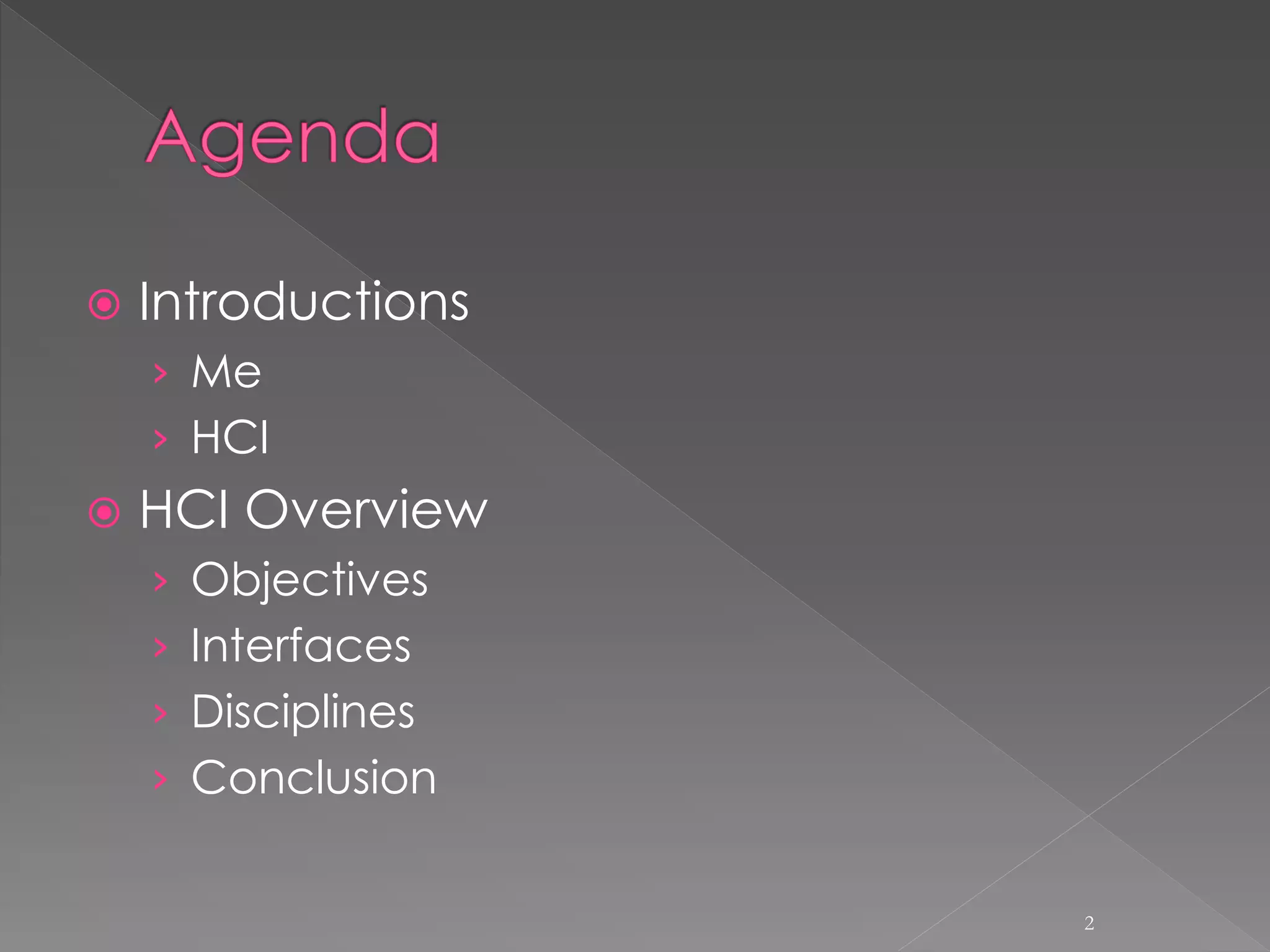 The document provides an overview of human-computer interaction (HCI). It discusses that HCI involves the transfer of information from the user to the machine and vice versa. It also describes different types of interfaces like command line interfaces, menu driven interfaces, graphical user interfaces, natural language interfaces, and motion sensor interfaces. Finally, it lists several disciplines that are involved in HCI, including cognitive psychology, neuroscience, ergonomics, engineering, design, anthropology, sociology, philosophy, linguistics, and artificial intelligence.