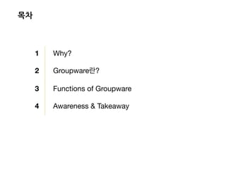 Why? Groupware란? Functionsof Groupware Awareness & Takeaway
