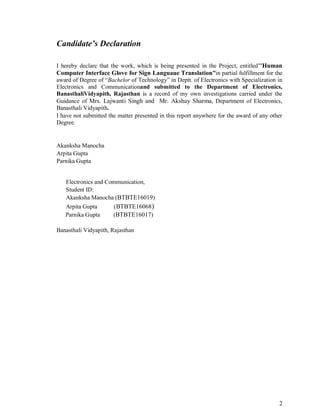 The document outlines a project report on the development of a human-computer interface glove designed to translate sign language into text and speech, aimed primarily at aiding deaf and mute individuals. The glove incorporates flex sensors and an inertial measurement unit to accurately capture and interpret hand gestures, facilitating communication and potentially integrating users into society without significant barriers. The report details the project's methodology, component descriptions, costs, advantages, limitations, future improvements, and concludes on the project's success in achieving its initial goals.