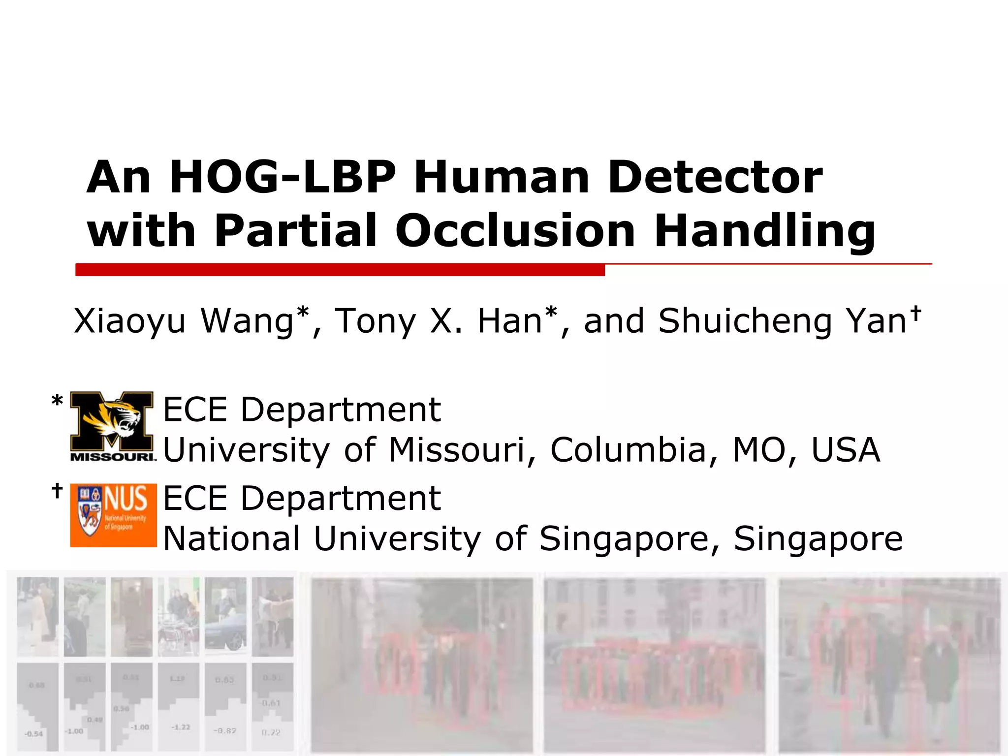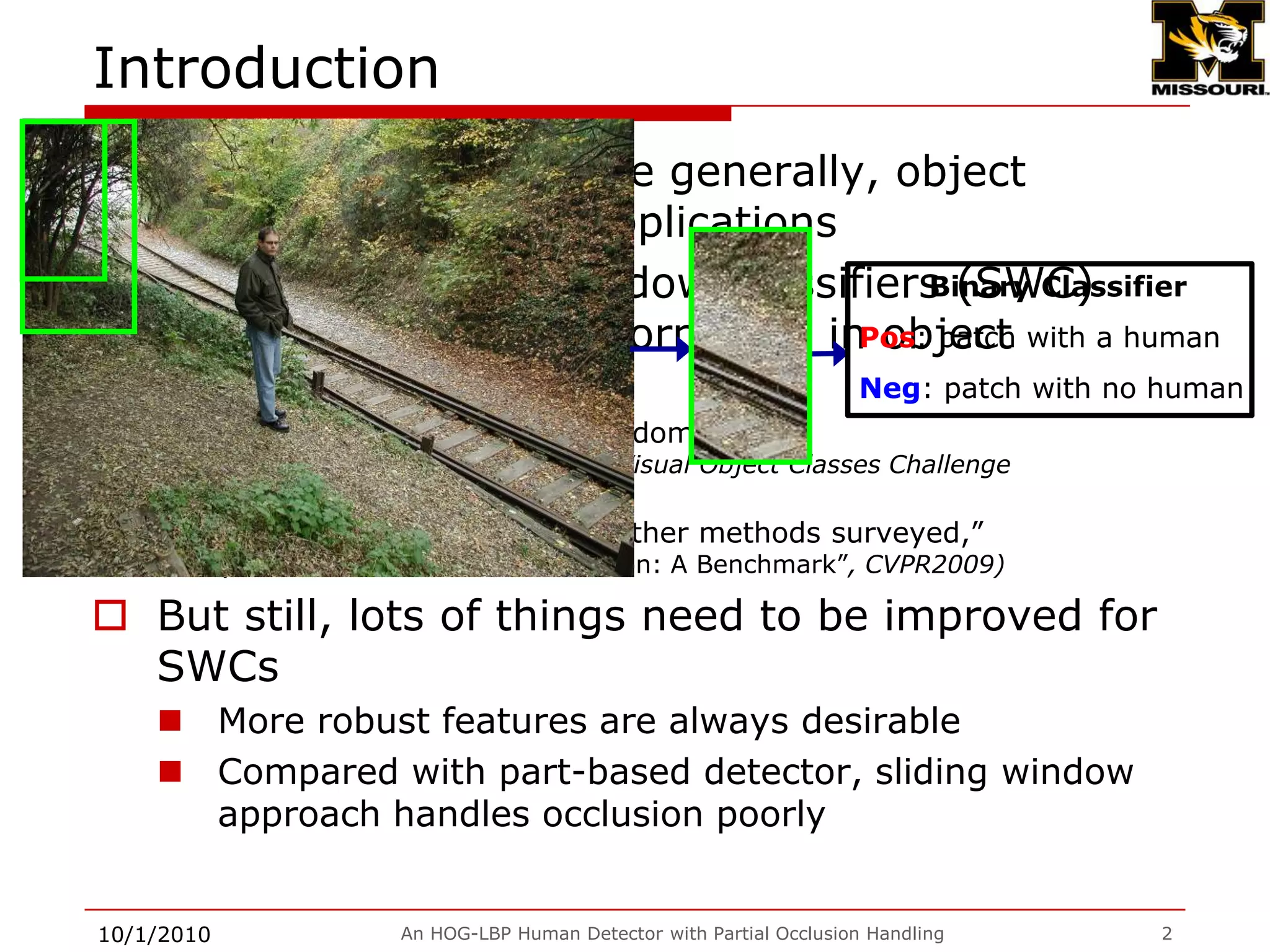 This document presents an HOG-LBP human detector with partial occlusion handling. It begins with an introduction of HOG and LBP features for human detection. It then describes adding cell-structured LBP and concatenating it with HOG to improve performance. Next, it covers handling partial occlusion by segmenting the classifier into local parts and inferring occlusion. Evaluation shows the approach improves detection of occluded pedestrians. It concludes with discussions on speed optimization and a real-time demonstration.