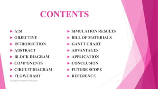 The document presents a human detection robot designed to operate in hazardous conditions, utilizing IoT technology, PIR sensors, and various other components for efficient human identification and monitoring. It outlines the project's aim, objectives, components used, circuit diagram, simulation results, and applications including disaster response and security measures. The project demonstrates a low-cost solution with potential for further development in dangerous environments.