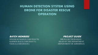 The document outlines a project proposing a human detection system using a quad-copter equipped with a passive infrared sensor to aid in disaster rescue operations. This system aims to quickly identify live victims trapped in debris by sending alerts to rescue operators, thereby facilitating timely interventions. The quad-copter is equipped with various sensors including fire and gas sensors, and operates autonomously to improve rescue efficiency in hazardous environments.