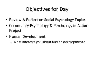 This document outlines the objectives and content covered in a Human Development class. The class will review and reflect on social psychology topics and experiments like the Milgram and Zimbardo studies. It will also cover community psychology and ways of promoting social change. Finally, the class will discuss what interests students about human development, including understanding oneself and others better across the lifespan. Key aspects of physical, cognitive, socioemotional, and moral development will be examined.