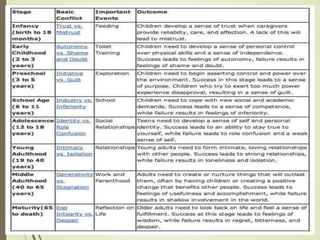 The document discusses key aspects of human development from birth to old age. It covers major periods and domains of development, as well as influential theories of development by Freud, Erikson, Piaget, and Vygotsky. Theories seek to describe and explain how development occurs and progresses through predictable stages and domains, influenced by both maturation and social/cultural factors.