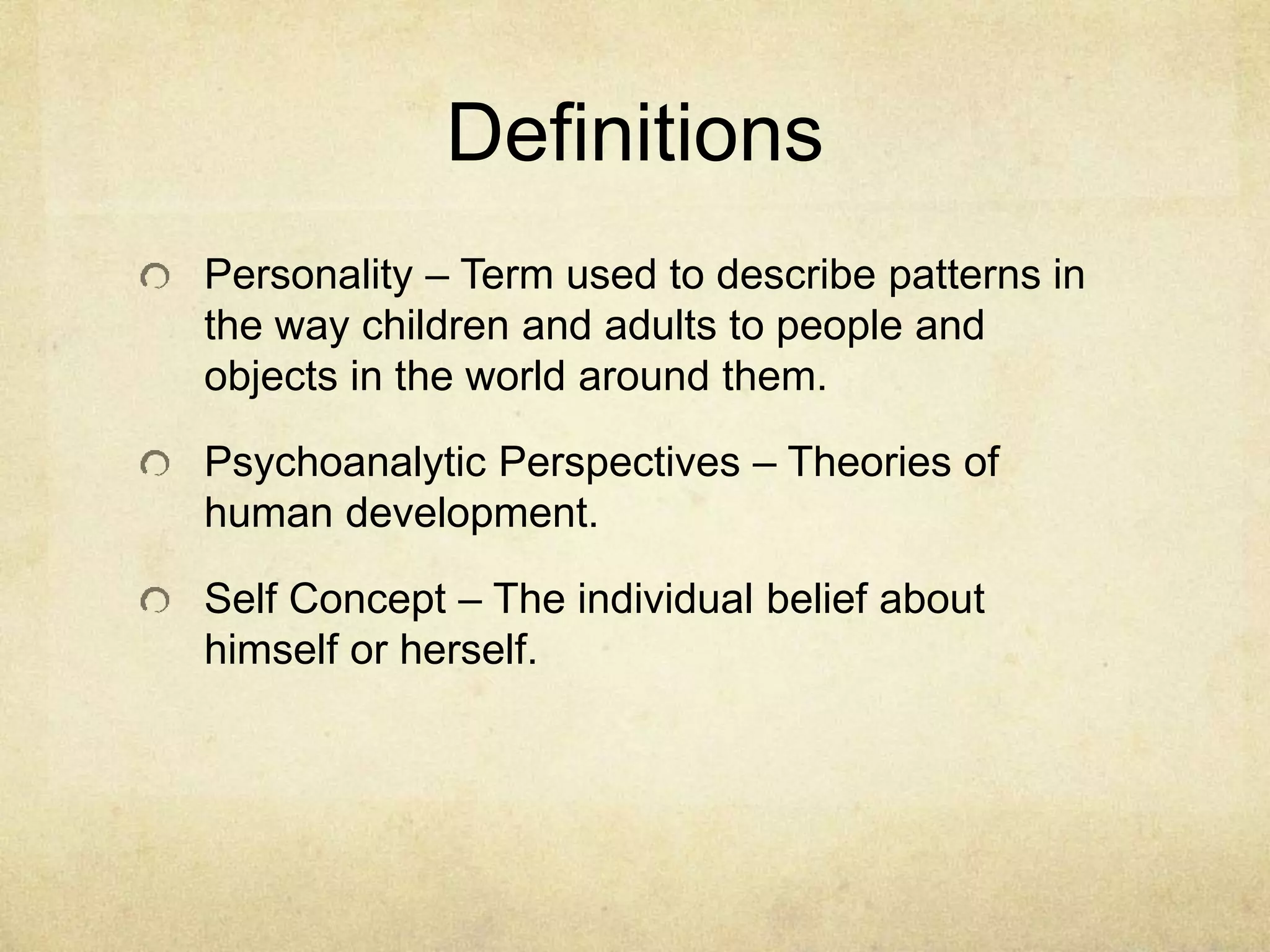 This document discusses social and personality development from various psychoanalytic perspectives. It covers development from infancy through late adulthood based on Freud and Erikson's theories. For infants, Freud believed oral gratification was important while Erikson focused on trust from nurturing. In early childhood, toilet training and autonomy vs shame were key. Middle childhood involved cultural skills and intimacy vs inferiority. Adolescence included identity formation and generativity vs stagnation in adulthood. Personality traits and continuity/change were also examined across the lifespan.