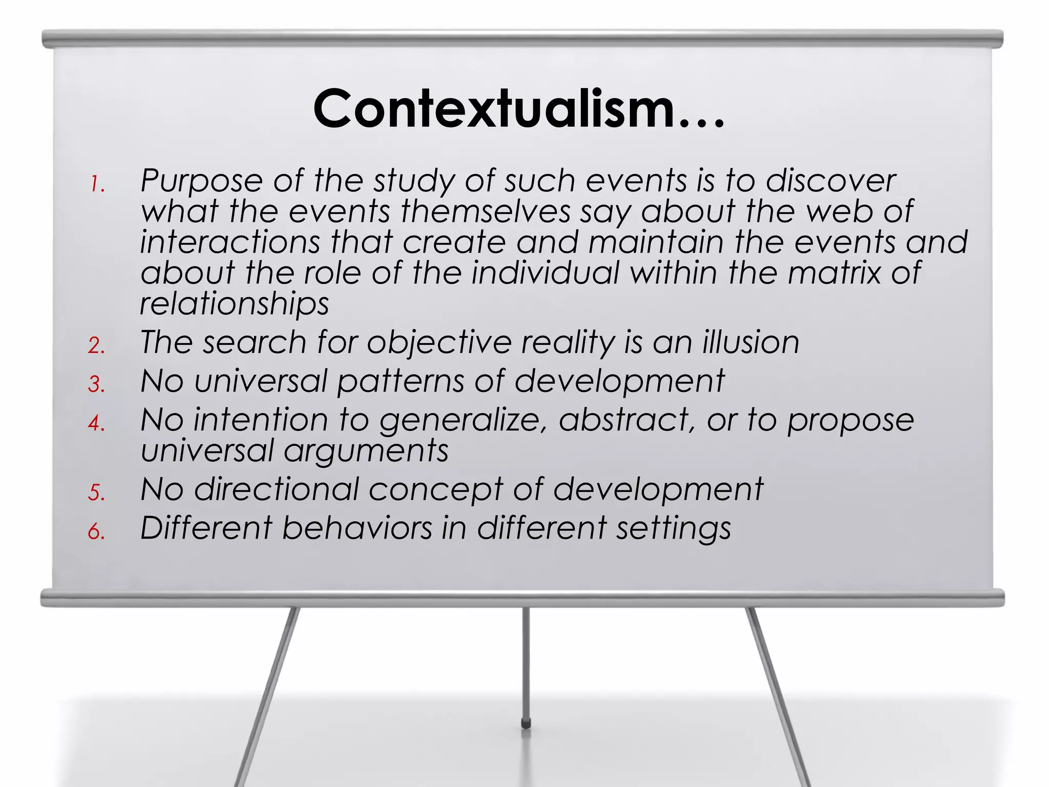 1) Contextualism, which rejects universal patterns of development and generalizations in favor of understanding individuals within relationships and settings.