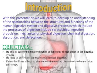 This presentation covers the anatomy and functions of the human digestive system, detailing processes such as ingestion, digestion, absorption, and waste elimination. It explains the roles of various digestive organs, including the mouth, stomach, small intestine, and large intestine, as well as enzymes and hormones involved in digestion. Additionally, it discusses related health issues like malnutrition and digestive disorders.
