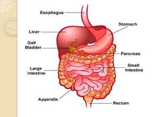 The human digestive system breaks down food through a multi-step process involving the mouth, esophagus, stomach, small intestine, large intestine and other organs like the liver and pancreas. Various hormones regulate digestion by signaling the stomach, pancreas and other organs to produce acids and enzymes that break down food. Nerves also control the movement of food through the digestive tract and the secretion of acids and enzymes.