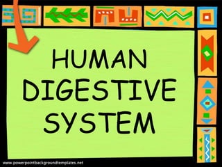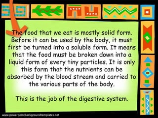 The digestive system breaks down food into tiny particles that can be absorbed by the bloodstream. Digestion begins in the mouth through chewing and saliva. Food then travels to the stomach where it is further broken down by acids and enzymes. The small intestine continues to break down food into absorbable nutrients which are then absorbed and transported to the body. The large intestine absorbs any remaining water before waste is excreted. Glands like the pancreas, liver, and gallbladder aid digestion by secreting enzymes and bile to break down proteins, fats, and carbohydrates.