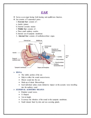 The document describes the structure and function of the human ear. It discusses the three main parts of the ear - the outer, middle, and inner ear. The outer ear collects sound waves and directs them through the external auditory meatus to the tympanic membrane. Vibrations then pass through the ossicles in the middle ear and oval window to reach the fluid-filled cochlea of the inner ear. Within the cochlea, vibrations stimulate hair cells which generate nerve impulses that travel to the brain for sound recognition and interpretation. The inner ear also contains structures like the semicircular canals that enable balance and spatial orientation.