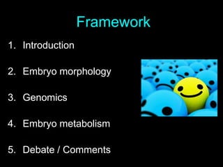1) The document discusses various methods for embryo selection to improve IVF outcomes, including embryo morphology, genomics/PGS, and embryo metabolism techniques.