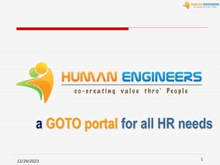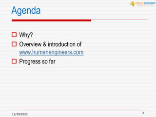 The document discusses the creation of a portal called www.humanengineers.com to serve as a one-stop destination for all HR needs. It aims to be a platform for knowledge sharing, collaboration, networking and marketing of HR products/services. The portal was recently launched with key modules. It has received positive reception but faces challenges around promotion and funding. Next steps include launching webinars, hiring more staff, and developing the HR marketplace and job portal functions.