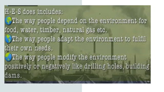 The document discusses the human-environment system approach in social sciences, highlighting its importance in understanding the interdependence between humans and their environment. It emphasizes the integration of social and natural sciences to address environmental and social issues, reflecting on how human-environment interactions have evolved since the industrial revolution. The approach, referred to as coupled human-environment systems, positions humans as integral participants responsible for sustainability and outlines key features and implications for research and community action.