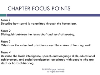 This document is from a chapter about sensory impairments. It discusses hearing loss and vision loss in 12 sections. Each section focuses on a topic such as how sound is transmitted through the ear, definitions of types of hearing loss, prevalence and causes of hearing loss and vision loss, and educational and social supports for people with sensory impairments.