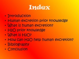 Human excretion and water are important topics. Human excretion is the process by which the body removes waste, with key parts being the urinary system, intestines, lungs and skin. Water, or H2O, makes up 70% of the human body and is vital for life. It is also important for excretion, as sweat and urine contain water. The document discusses human excretion, water, and how water aids the excretion process.