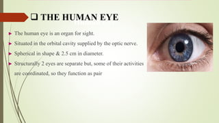The human eye has three layers: an outer fibrous layer, middle vascular layer, and inner nervous tissue layer. It contains several parts that work together to allow vision, including the iris, pupil, cornea, retina, and optic nerve. The cornea and pupil allow light to enter while the retina converts light to electrical signals transmitted by the optic nerve to the brain. Contraction and relaxation of the iris and ciliary muscles control the amount of light entering through the pupil and focus of the lens.