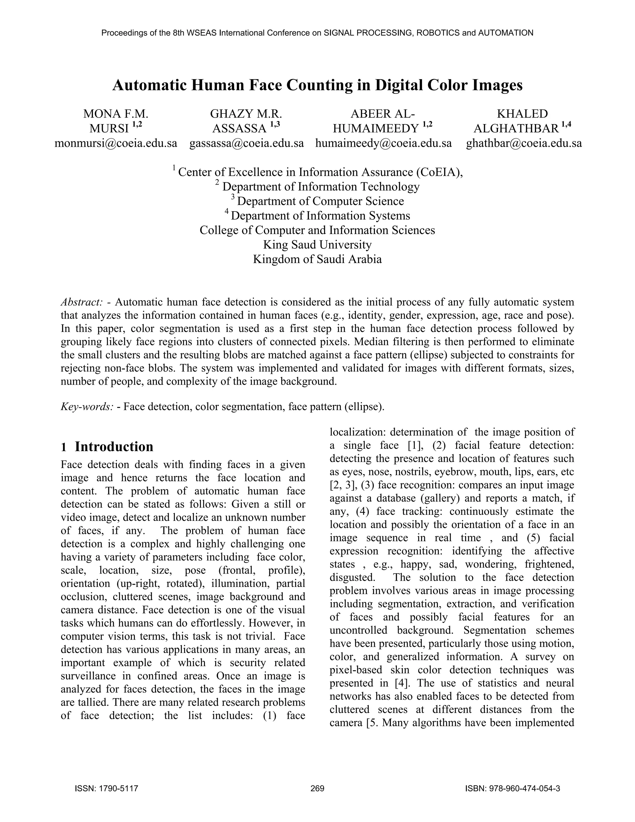 1) The document discusses automatic human face counting in digital color images. Color segmentation is used as the initial step, followed by clustering face regions and median filtering to eliminate small clusters.