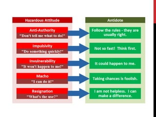 The document outlines five hazardous attitudes that pilots should avoid to ensure safer flying: anti-authority, impulsivity, invulnerability, macho, and resignation. Each attitude can negatively influence a pilot's decision-making and heighten the risk of accidents. Understanding these attitudes is essential for pilots to manage risks effectively and make better choices in the air.