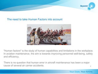 Human factors is the study of how human capabilities and limitations impact safety and efficiency in the workplace, especially aircraft maintenance. Several air accidents have been caused by human error in maintenance. To improve safety, the aviation industry must understand how factors like personnel, equipment, procedures, and environment interact and optimize that relationship. This includes considering physiology, psychology, workplace design, and the interface between humans and machines. Understanding human factors can help reduce errors by improving training, procedures, tools, and inspections. About 70% of early aircraft accidents were due to human error, and maintenance deficiencies remain a major cause today due to issues like staff shortages, time pressures, and failures to follow approved procedures. Reducing human error requires recognizing risks and