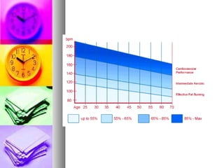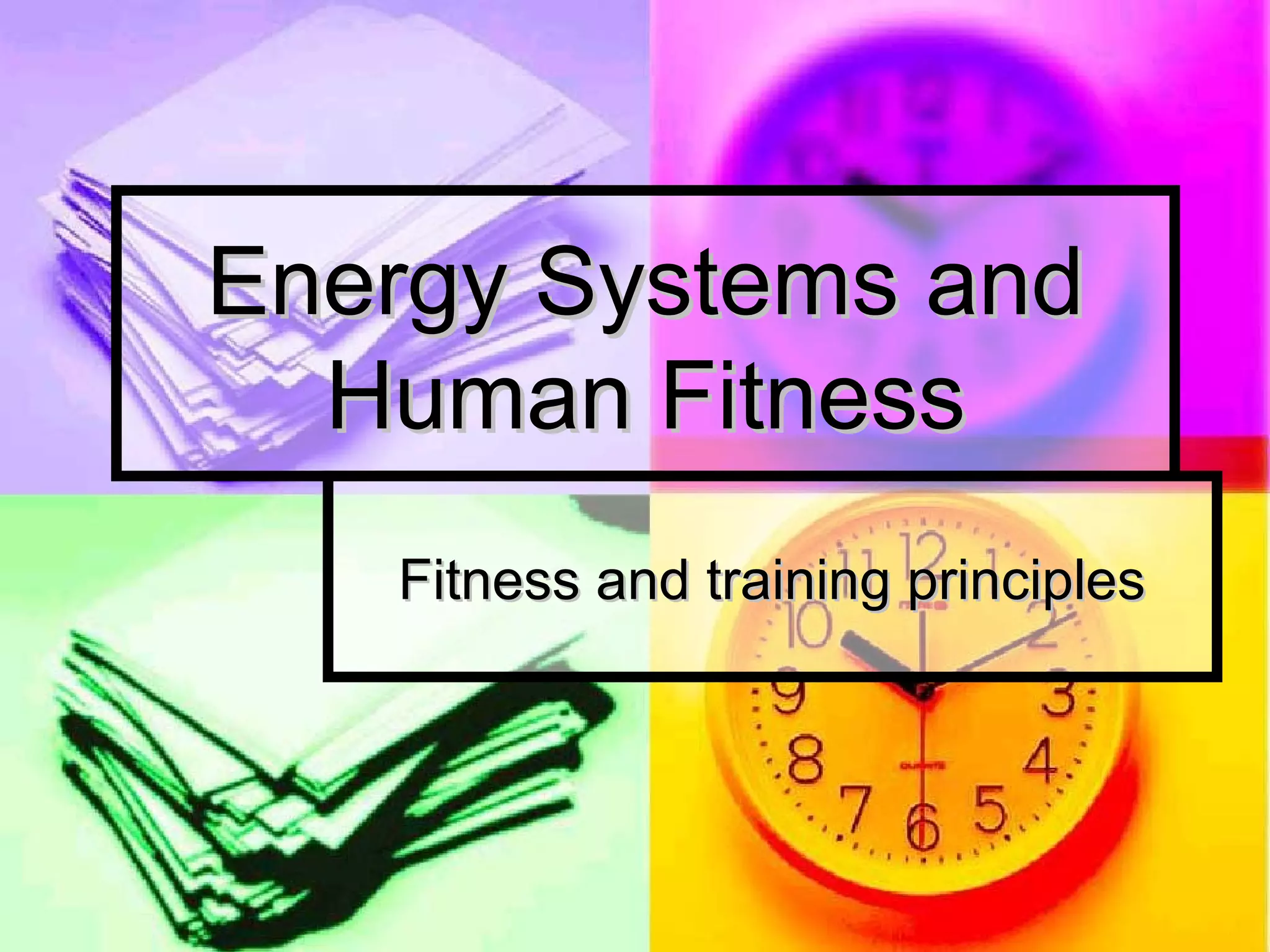 The document discusses the components of fitness and principles of training. It defines fitness as the ability to carry out daily tasks without undue fatigue and with reserve energy. The components of fitness include health-related components like cardiorespiratory endurance, muscular strength and flexibility, as well as skill-related components like speed, power, agility and coordination. The principles of training that can improve performance are specificity, progressive overload, and applying the FITT principles of frequency, intensity, time and type to a training program.