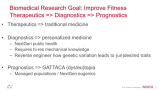 The document discusses several topics related to biomedical research and human genetics. It notes that the goals of therapeutics, diagnostics, and prognostics are improving fitness. It also discusses themes of eugenics and determinism, media technology and privacy, trends in DNA sequencing costs and capacity, and challenges around data analysis and clinical applications of large-scale human genetics.