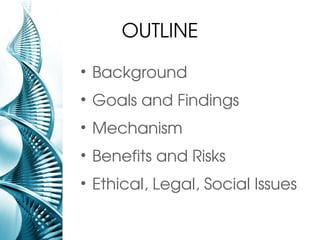 The document discusses the Human Genome Project, an international research effort begun in 1990 with the goals of mapping all of the genes in human DNA and determining the sequences of chemical base pairs that make up human DNA. It aimed to identify the approximately 30,000 genes in humans, determine the sequences of the 3 billion base pairs of human DNA, and address ethical issues. The project was originally expected to last 15 years but was completed earlier than expected, in 2003, due to rapid technological advances.