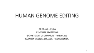 Genome editing is a method to change an organism's DNA. It can treat genetic diseases like cancer and sickle cell anemia. The CRISPR-Cas9 system is currently the most widely used genome editing method due to its simplicity, accuracy, and low cost. While research using CRISPR in animals has provided insights, human trials are limited due to safety and ethical concerns. Germline editing could affect future generations but is not allowed in many countries. Somatic gene therapy has shown promise for treating diseases but risks of off-target edits remain. International discussions are ongoing around the responsible use of this developing technology.