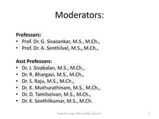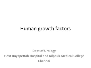 This document discusses human growth factors and their roles in various processes from the Department of Urology at GRH and KMC in Chennai. It lists the moderators and their roles. Growth factors are defined as signaling molecules that stimulate cellular growth, proliferation, and differentiation. Examples include cytokines and hormones. The document discusses the cell cycle and how growth factors interact with cell surface receptors to affect gene transcription and cell cycle progression. It provides examples of many growth factors including their functions and roles in various conditions.