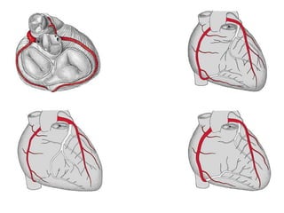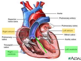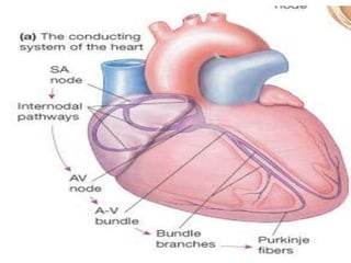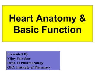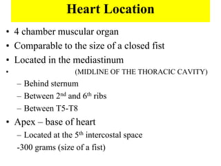 The heart is a four-chambered muscular organ located in the mediastinum protected by the pericardium. It pumps blood through two circuits - the pulmonary circuit to the lungs and systemic circuit to the rest of the body. The heart walls have three layers - epicardium, myocardium and endocardium. It has four chambers - two upper atria which receive blood and two lower ventricles which pump blood out. It uses valves to ensure one-way blood flow. The sinoatrial node initiates electrical impulses which coordinate contractions through the conduction system.