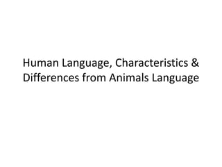 Human language has several unique properties that distinguish it from animal communication systems. Human language allows for displacement by referring to things and events not present, it is arbitrary where linguistic forms are not inherently related to their meanings, and it is productive allowing for infinite novel utterances. In contrast, animal communication involves limited, fixed signals tailored to the current time and place. Additionally, human language is acquired culturally rather than instinctively and has a duality of distinct sounds and meanings organized at two levels.