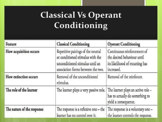 This document provides an overview of several theories of human learning and their implications for teaching methods. It discusses behaviorism, meaningful learning theory, and humanistic psychology. Behaviorism, according to Pavlov and Skinner, views learning as the acquisition of behaviors based on environmental conditioning. Meaningful learning theory, from Ausubel, emphasizes relating new concepts to existing knowledge structures. Humanistic psychology, from Rogers, focuses on empowering learners and facilitating self-directed discovery. The document also covers types of learning, reasoning processes, and factors like intelligence and aptitude that influence learning. Finally, it analyzes several teaching methods and their strengths and weaknesses in applying learning theories.