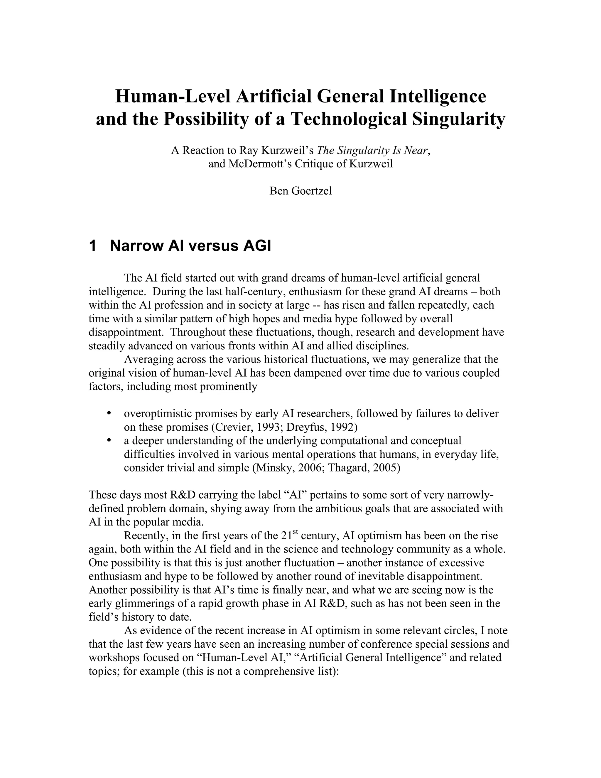 This document discusses different scenarios for the future development of artificial general intelligence (AGI). It begins by contrasting narrow AI, which focuses on solving specific problems, with AGI, which would involve a system that can understand itself, generalize knowledge across domains, and transfer skills like humans. The document then outlines several possible scenarios using the framework of scenario analysis: 1) steady incremental progress of narrow AI eventually reaching AGI, 2) narrow AI continues successfully but AGI is not achieved, and 3) AGI is developed, rapidly improves itself, and leads to a technological singularity transforming society in unpredictable ways. It discusses these scenarios and their implications in more detail.