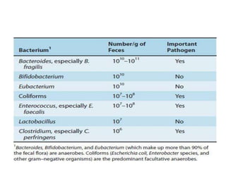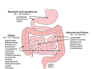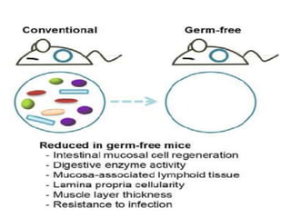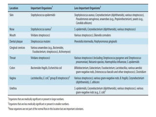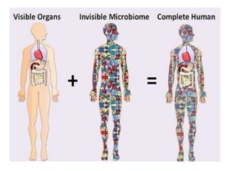 This document discusses the human microbiome, which refers to the microorganisms that inhabit different areas of the human body. It notes that the microbiome develops immediately after birth and includes bacteria, yeasts and protozoa. The microbiome plays an important role in health, such as immune system development, but can also contribute to diseases. The document then describes the types of microbes typically found in different body sites like the gut, skin, respiratory and genitourinary tracts.