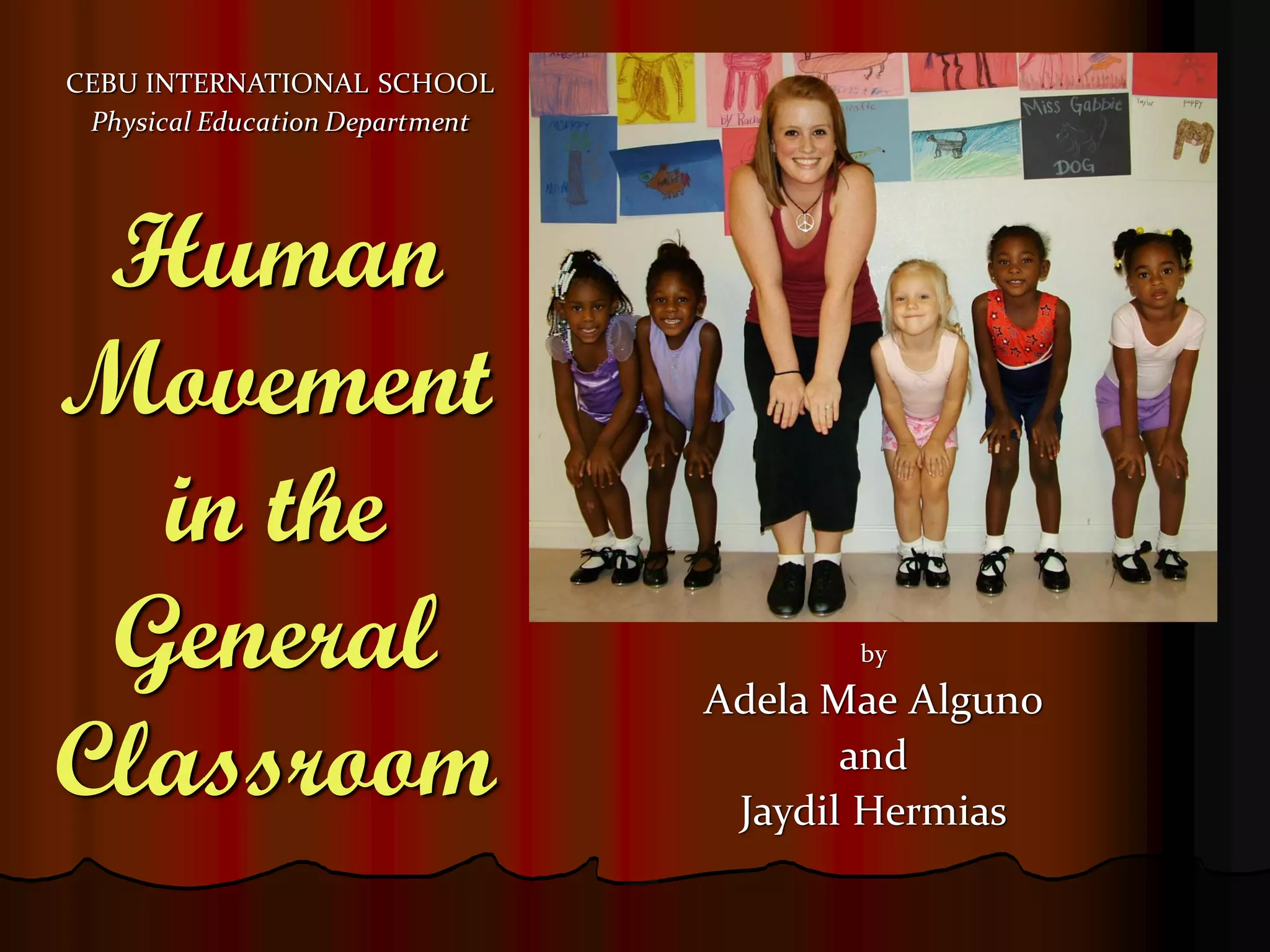 This document outlines a workshop on using human movement and dance in the classroom. The workshop will include a presentation, activity, group work, group presentations, and wrap-up. Integrating movement can benefit kinesthetic learners and increase engagement. Studies show dance can improve attitudes towards academic subjects, address behaviors, and provide alternative forms of assessment. The workshop models using movement to teach concepts like insect metamorphosis. It encourages teachers to consider all learning styles and intelligences.