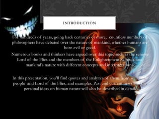 This document explores the nature of humanity, debating whether humans are born evil or good, incorporating perspectives from philosophers like Rousseau and Adam Smith, as well as real-world examples like Mother Teresa and serial killers. It argues that nurturing influences shape individuals, suggesting that environment can corrupt innate goodness, while also asserting that humanity has an inherent tendency towards caring for others. The analysis is supplemented by quotes from literary works such as 'Lord of the Flies' and examines interviews regarding views on human nature.