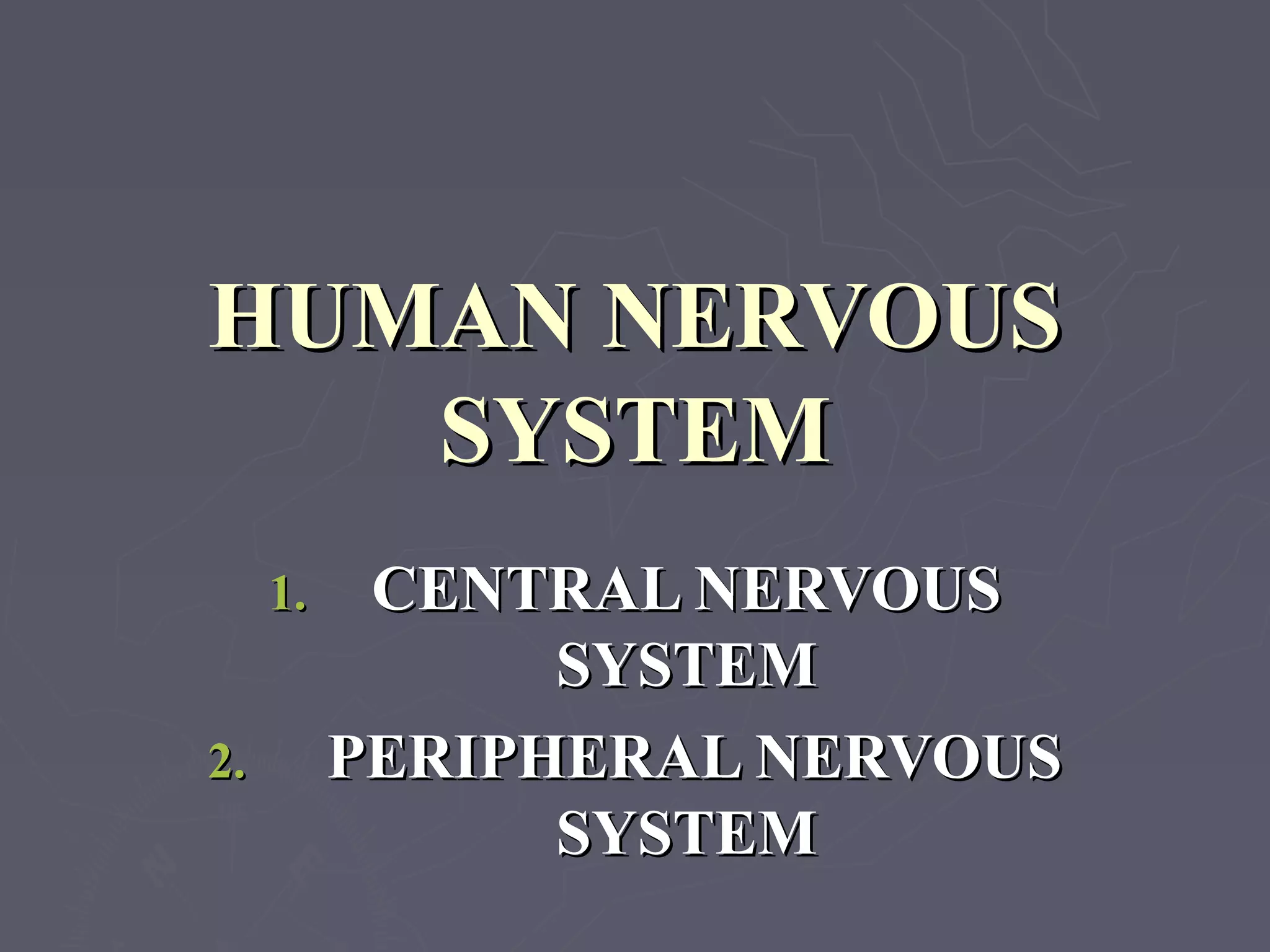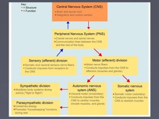 The human nervous system consists of two main parts: the central nervous system and the peripheral nervous system. The central nervous system is comprised of the brain and spinal cord. It contains billions of neurons and is protected by the skull, vertebrae and membranes. The peripheral nervous system connects the central nervous system to the rest of the body and is divided into the somatic and autonomic systems. The autonomic system regulates involuntary functions and contains the sympathetic and parasympathetic divisions.