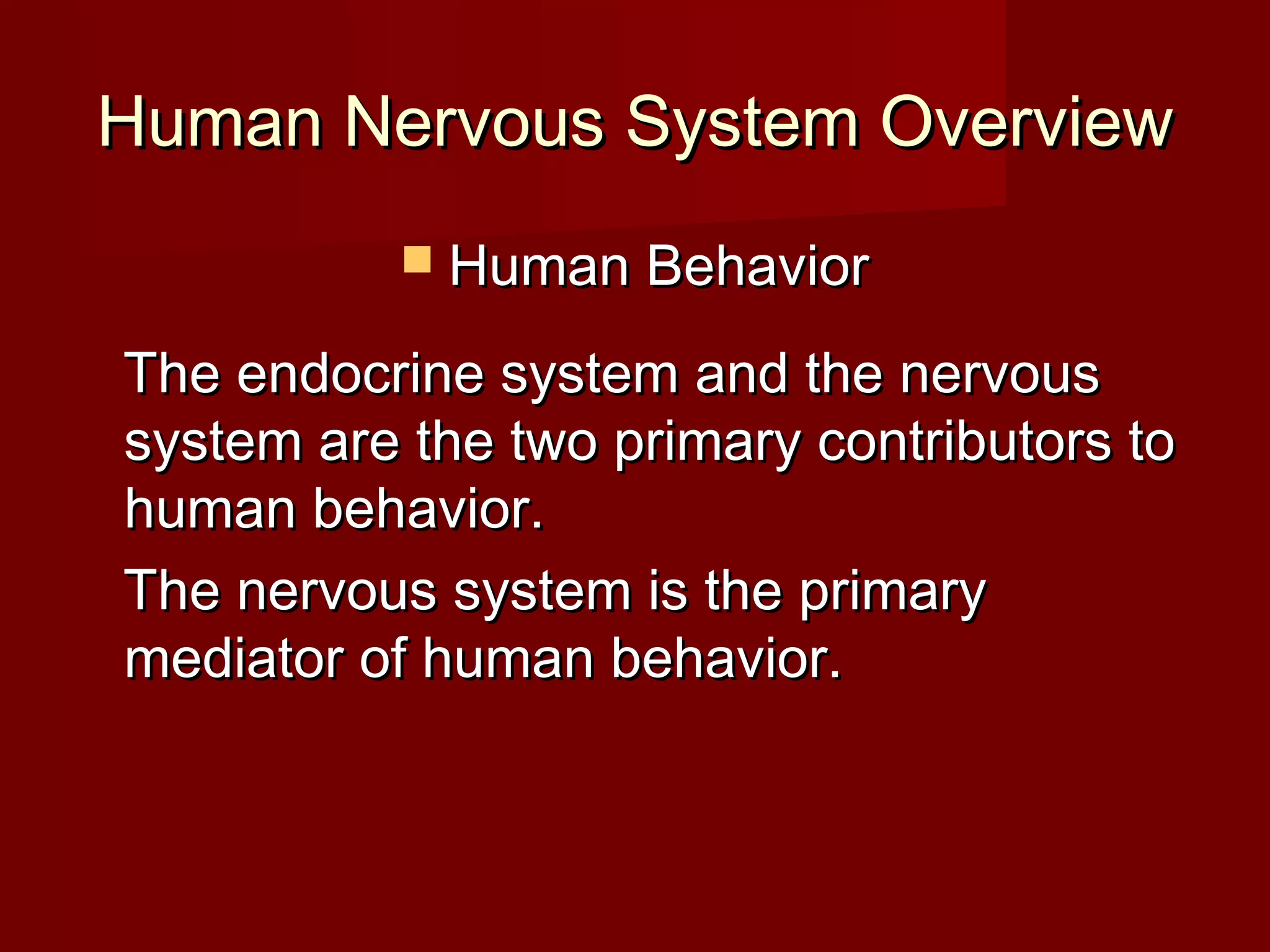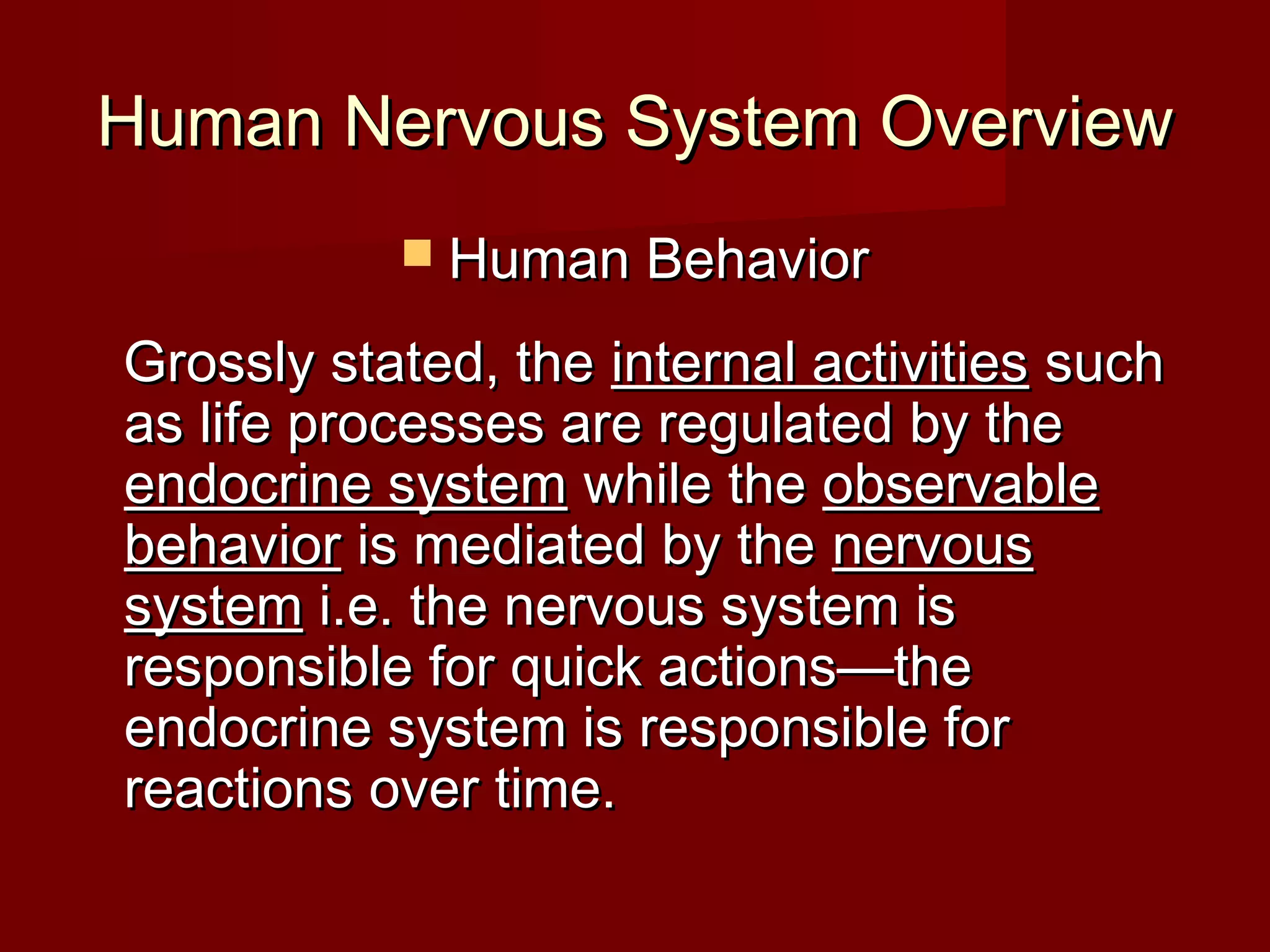 The human nervous system is composed of nerves, the brain, spinal cord, and meninges. It works with the endocrine system to regulate human behavior and life processes. The nervous system mediates quick actions through neural synapses using neurotransmitters, while the endocrine system is responsible for longer-term reactions. Key areas of the brain that influence human senses are the thalamus and hypothalamus.